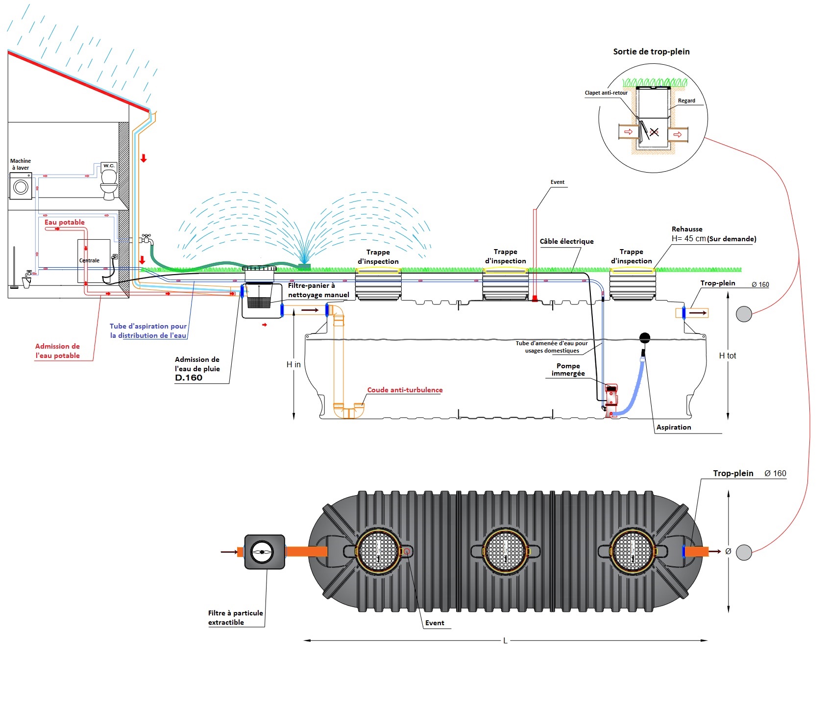 Le filtre a pour fonction de retenir les divers déchets transportés par l’eau et de canaliser celle-ci à l’intérieur du réservoir via un embout décanteur dont la partie terminale est orientée vers le haut de manière à prévenir les brassages de sédiments se trouvant au fond du réservoir.