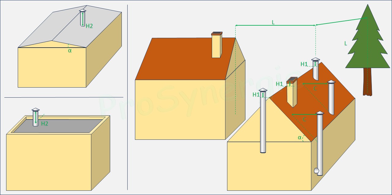 ATTENTION : cette disposition indiquée dans certains avis CSTB est difficilement interprétable et sujette à caution. Cette disposition ne figure pas dans le DTU 24.1. Le respect de cette disposition ne garantit pas dans tous les cas un bon tirage. Dans la mesure du possible, appliquer la règle des 40 cm au-dessus du faitage.