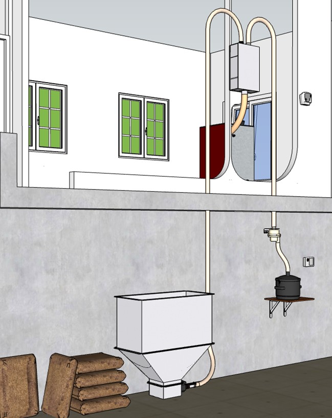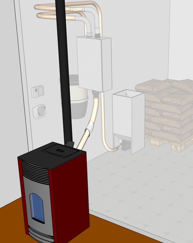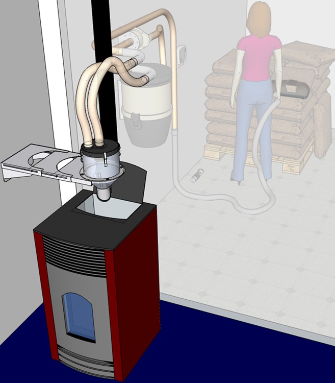 Celui-ci place le flexible dans la trémie du poêle et met en route le système à partir du lieu de stockage du combustible.