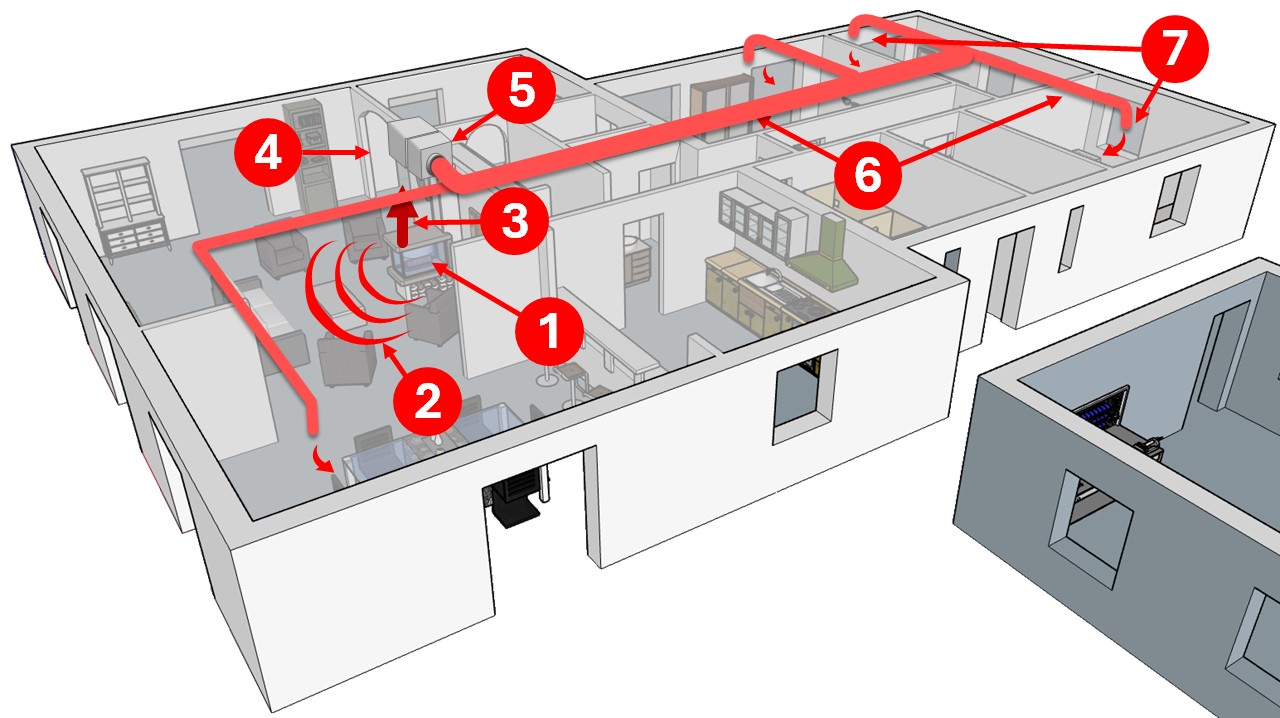Il est important de tenir compte des logiques de circulation d’air. En particulier, on prendra en compte les extractions d’air vicié (VMC) qu’on trouve dans les pièces humides (cuisines, SB, WC…). Le Centre scientifique et technique du bâtiment (CSTB) recommande fortement de ne pas installer dans ces pièces de bouches d’air chaud. En effet, l’extraction d’air induit que l’air chaud diffusé dans les pièces à vivre sera progressivement dirigé vers les pièces humides. Par ailleurs, il résulterait d’un apport d’air chaud dans ces pièces une surpression qui pourrait contribuer à la diffusion de l’air vicié vers les pièces à vivre.